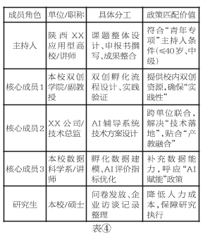 正面案例:以申报陕西省教改重点课题(双创教育类)《AI赋能应用型高校双创项目孵化指导研究》为例,研究团队结构如表④。