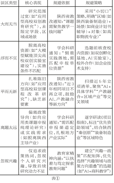 应用型高校青年教师选题易陷入大、浮、平、离、忽五类误区,需结合政策要求针对性规避。(见表①)