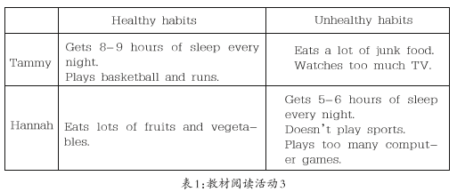 2.获取与梳理:通过教材阅读活动3(见表1)中Tammy与Hannah的生活习惯描述,组织学生讨论“谁的生活方式更健康”“为什么?”并鼓励学生提出更具体的健康建议。学生在梳理与讨论中对两人的习惯进行判断与评价,形成独到的见解,加深对健康生活方式的理解。