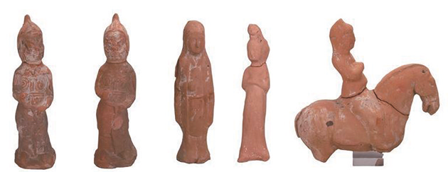 这些墓葬中,M5为斜坡墓道单天井单砖室墓,因被严重盗扰,未发现葬具和人骨。M5共出土器物19件,有铜镜1件、开元通宝1枚、残铜饰1件、陶动物俑4件、陶人物俑7件、陶瓶1件、陶塔式罐底座和盖各2件。