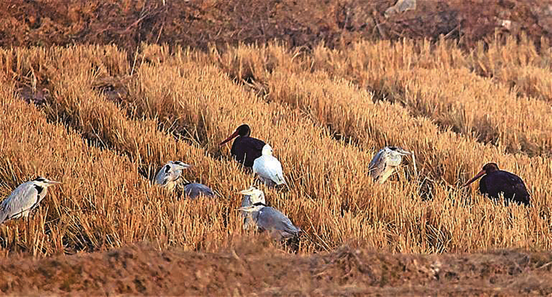 近日,陕西黄河湿地省级自然保护区大荔段迎来大批迁徙候鸟。上万只水鸟齐聚于此,扎堆栖息、翩跹起舞。图为12月13日,国家一级保护动物黑鹳与苍鹭、白鹭等水鸟栖息觅食。