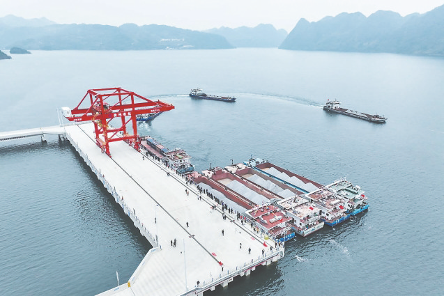 12月16日,随着一台桥式起重机将装有沉淀硫酸钡的集装箱吊入“航电624”货船后起航,贵州首个自动化码头——瓮安港云中港区正式开港。云中港区位于贵州省黔南州瓮安县天文镇乌江干流右岸,配置岸电设施、智能化集装箱起重机等设备,在推进节能减排的同时可有效提升运营效能。图为船舶离开瓮安港云中港区。