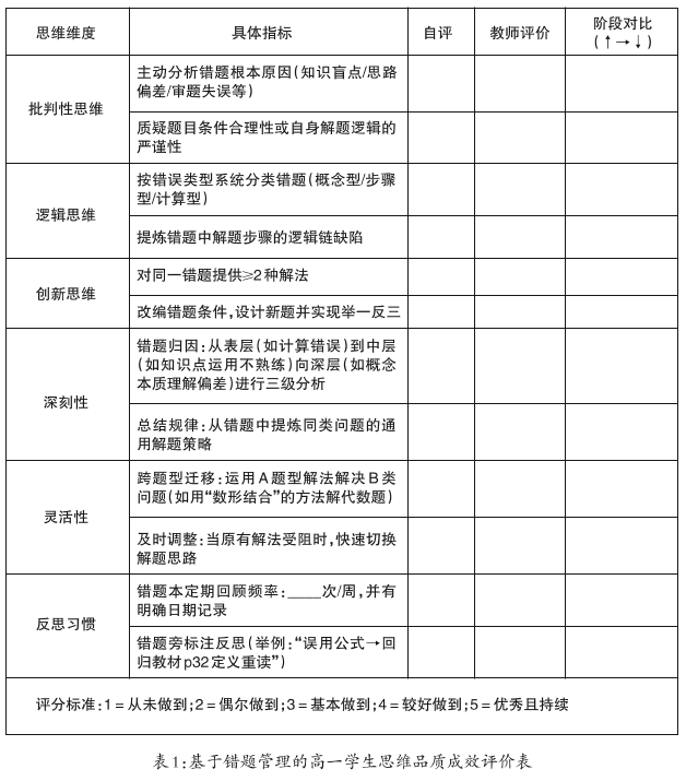本校借助过程记录表、课堂观察量表及数字化技术,让学生的逻辑链条、批判意识、创造尝试等思维过程可视化,教师能够快速定位学生思维的断点,推动学生的思维反思从“结果导向”转变为“过程反思”。以错题管理中的思维品质评价为例,如表1所示。