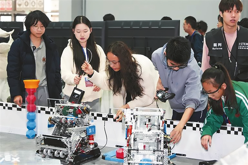 1月3日,2025—2026赛季VEX机器人亚洲公开赛总决赛历经3天的智慧角逐与激情碰撞,最终在西安临空会展中心落下帷幕。这场被誉为“机器人奥运会”的顶级青少年科创赛事,会聚了全国近700支精英赛队、2500余名科创少年。图为参赛选手在调整机器参数。