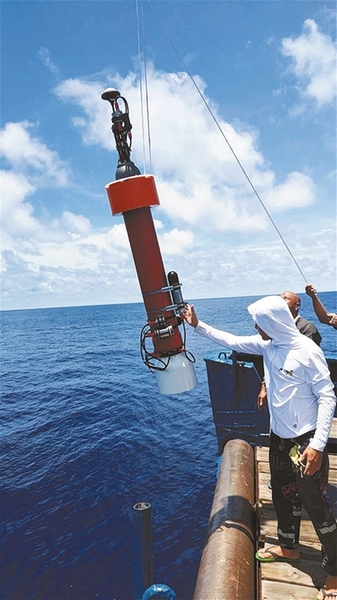 海洋生物地球化学原位传感器搭载Argo浮标海试布放现场(资料照片)。
