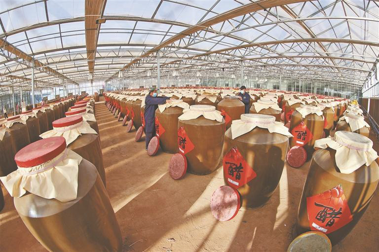 渭南市大荔县段家镇依托当地丰富的柿子、苹果、梨等资源,采取“党支部+公司+基地+农户”的模式,采用传统陶缸自然发酵工艺,将原本只能鲜销的果品转化为5种风味果醋,年产果醋75万公斤。图为工人在查看果醋发酵程度。