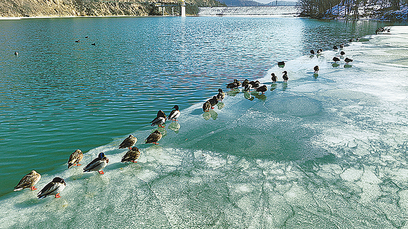 冬日正午,延安市红庄水库呈现出一半碧波荡漾、一半冰凝如镜的景致。在暖阳照耀的冰水交界处,成群野鸭安然栖息,它们或漫步冰上,或悠然戏水,时而展翅嬉戏、互相追逐,为静谧的冬日画卷注入灵动生机,彰显出人与自然和谐共生的美好意境。