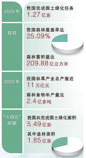 记者从全国林业和草原工作会议上获悉:2025年,我国完成国土绿化任务1.27亿亩,其中营造林5345万亩,退化草原修复治理7390万亩。目前全国森林覆盖率达25.09%,森林蓄积量达209.88亿立方米,绿色发展底色成色更加鲜明。