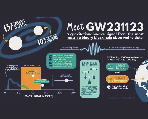 2025年7月14日在英国苏格兰格拉斯哥举行的第24届国际广义相对论与引力大会(GR24)暨第16届爱德华多·阿马尔迪引力波会议上,国际合作团队——LIGO-Virgo-KAGRA合作组报告称,借助美国激光干涉引力波天文台(LIGO)等,探测到迄今最大质量黑洞合并事件。该成果对理解黑洞成长意义重大。
