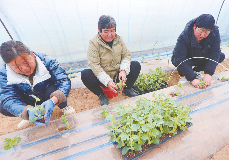 1月26日,渭南市大荔县羌白镇焦家村的温室大棚里,村民抢抓农时栽植吊篮西瓜、甜瓜。