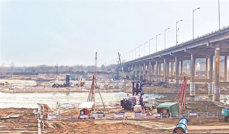 渭河眼下正值枯水期,福银高速西安至永寿段改扩建工程的关键控制性工程——渭河特大桥施工现场,一派繁忙景象。福银高速西安至永寿段改扩建工程全长约79公里,总投资约131.26亿元。自2025年10月底开工建设以来,工程已从前期准备阶段全面转入主体实质性施工阶段。图为2月2日,福银高速西安至永寿段改扩建工程渭河特大桥施工现场。