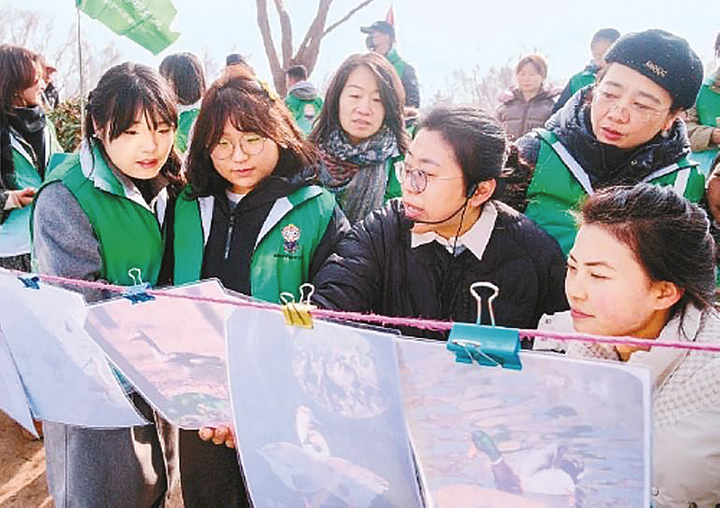 2月2日,世界湿地日,以“湿地与传统知识:致敬文化遗产”为主题的宣传活动在西安浐灞国家湿 地 公 园 举行。活动邀请市民代表、志愿者、中小学生共同参与观鸟、研学等丰富活动,沉浸式领略“地球之肾”的独特魅力,凝聚起守护湿地生态 的 全 民 共识。图为工作人员向志愿者和孩子们讲解鸟类知识。