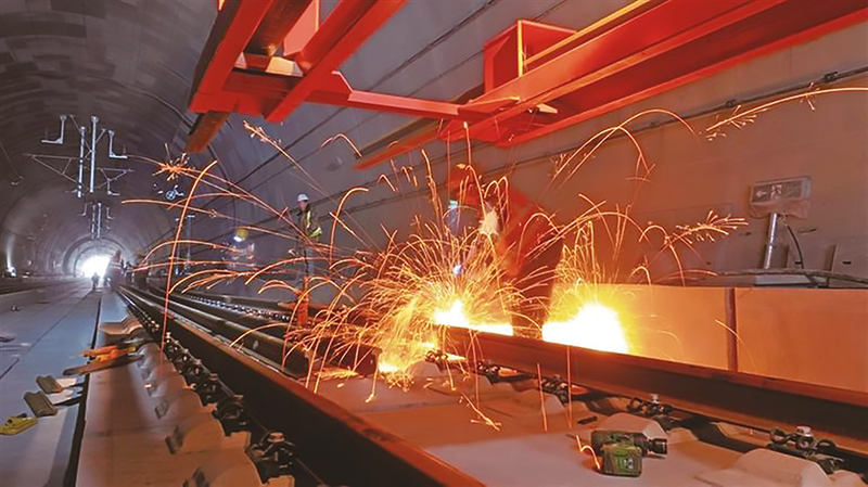 图为最后一对钢轨在安康西站铺轨现场精准落位并完成焊接锁定。