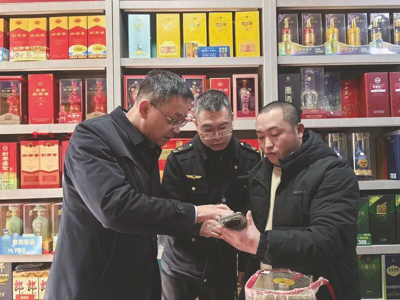 近日,铜川市市场监管综合执法支队负责人带队,组织执法人员对辖区内超市、商店及餐馆开展了酒类市场专项执法检查,排查是否存在侵犯注册商标专用权等知识产权违法行为。图为执法人员向经营户详细讲解《中华人民共和国商标法》等法律法规。