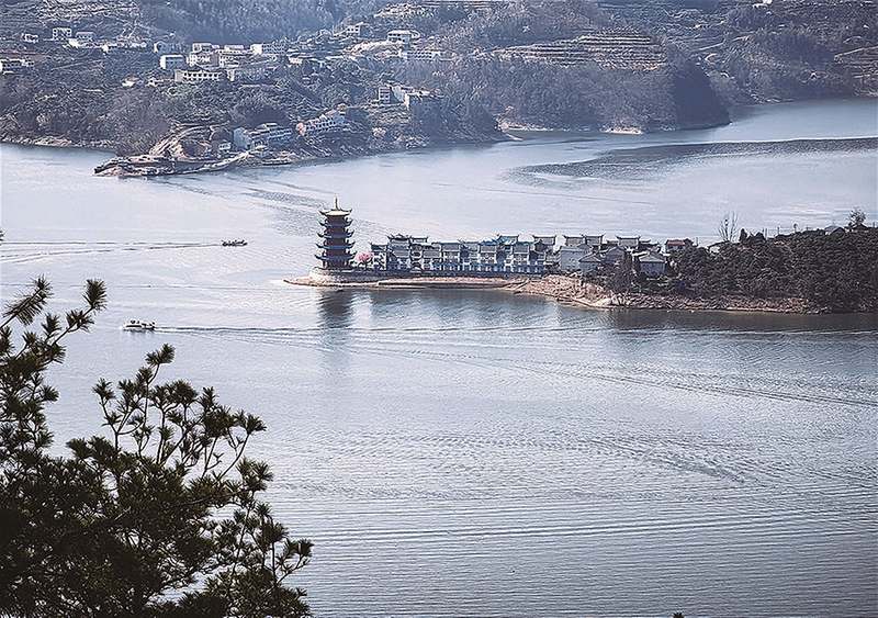初春的瀛湖,湖光山色交相辉映,如一幅美丽的画卷。图为远眺新开园的瀛湖汉水街文旅影视基地。