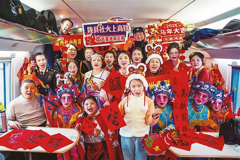 走进西延高铁C8916次列车车厢,张灯结彩的布置,让喜气扑面而来,红灯笼错落点缀,灯谜卡片轻轻摇曳,一步一景皆是关中民俗的独特韵味。几位身着传统服饰的鼓手挥槌击鼓,铿锵有力的鼓点瞬间点燃全场。陇县社火惊艳亮相,小演员们踩着鼓点,舞动长缨,化身穆桂英、关公、花木兰等经典人物,眼神坚定又带几分萌态,惟妙惟肖的表演引来阵阵喝彩。“没想到在高铁上还能见到这么地道的陇州社火!”旅客赵女士说。