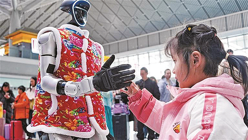 3月2日,西安北站候车大厅暖意融融,“喜乐元宵·智慧伴行”主题活动启幕。图为小乘客与央视春晚同款机器人互动。