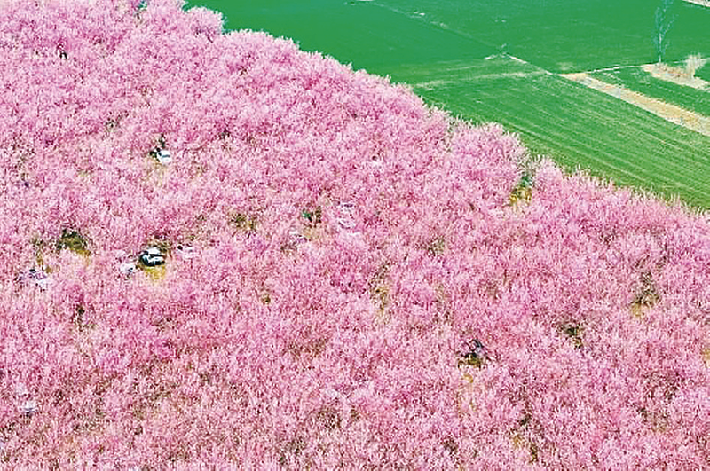 3月11日,西安市鄠邑区丁村梅园迎来盛花期,百亩梅花竞相绽放。花海与麦田相映成画,吸引众多市民游客前来踏青赏花。