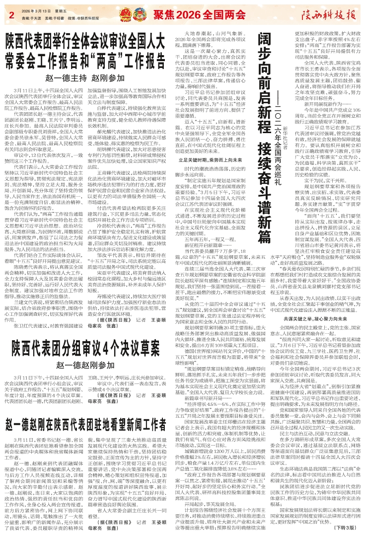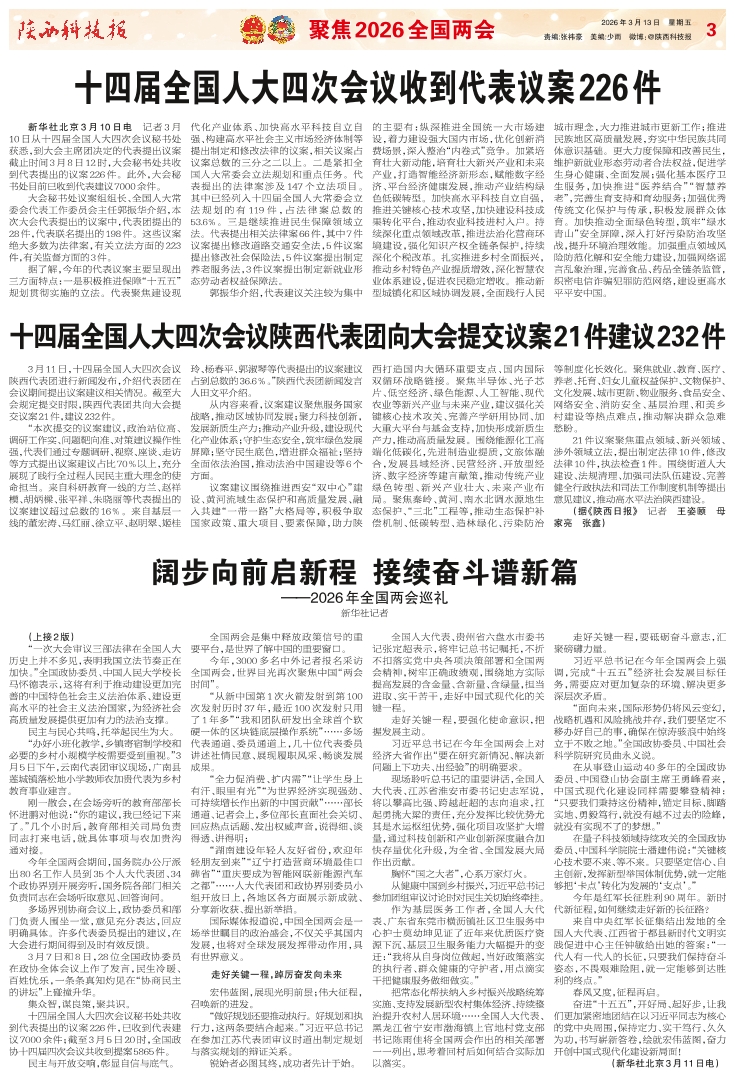 十四届全国人大四次会议陕西代表团向大会提交议案21件建议232件