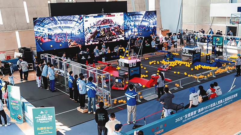 3月13日至15日,2026FIRST机器人竞赛(FRC)上海国际区域赛在华东师范大学闵行校区举行,来自国内外的50支参赛队伍、近千名青少年选手同台竞技,围绕“发掘重建”主题展开机器人科创比拼与智慧角逐。图为比赛现场。