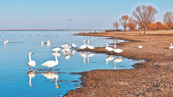 眼下正值候鸟迁徙季,大批北归候鸟陆续在榆林境内的河流、湖泊等湿地落脚休憩。日前,成群的大天鹅在榆林市榆阳区河口湿地栖息觅食。