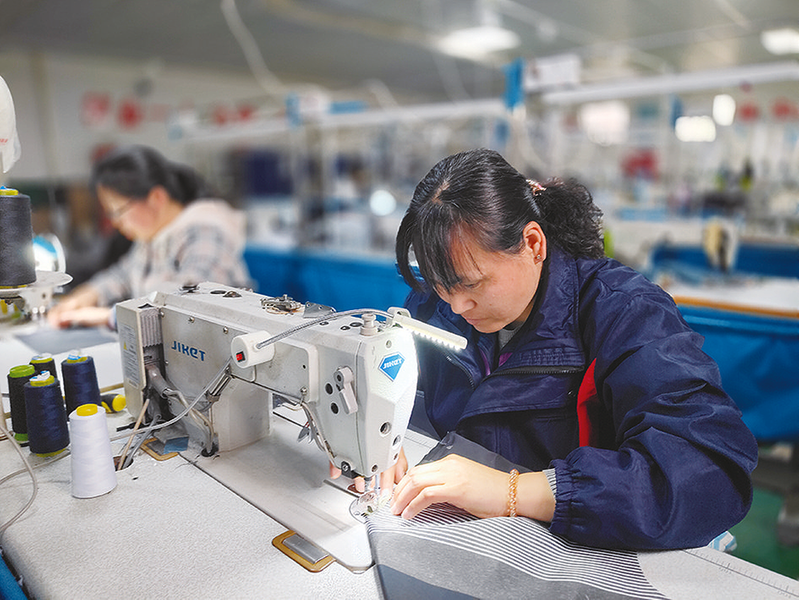 图为4月8日,位于武功县的陕西美源服饰有限公司加工生产车间内,工人正熟练地操作多种设备缝制衣物。