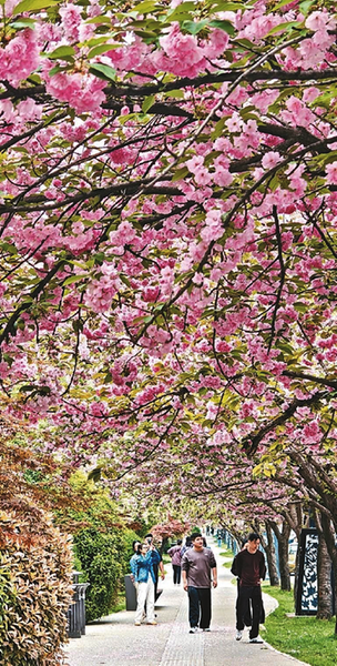 4月7日,西安曲江池西路的樱花进入盛花期,道路两侧樱花如云似霞,绵延成一条浪漫的“樱花长廊”,吸引了众多市民游客前来拍照,成为春日古城一道亮丽的风景线。图为市民游客在“樱花长廊”游览、拍照。