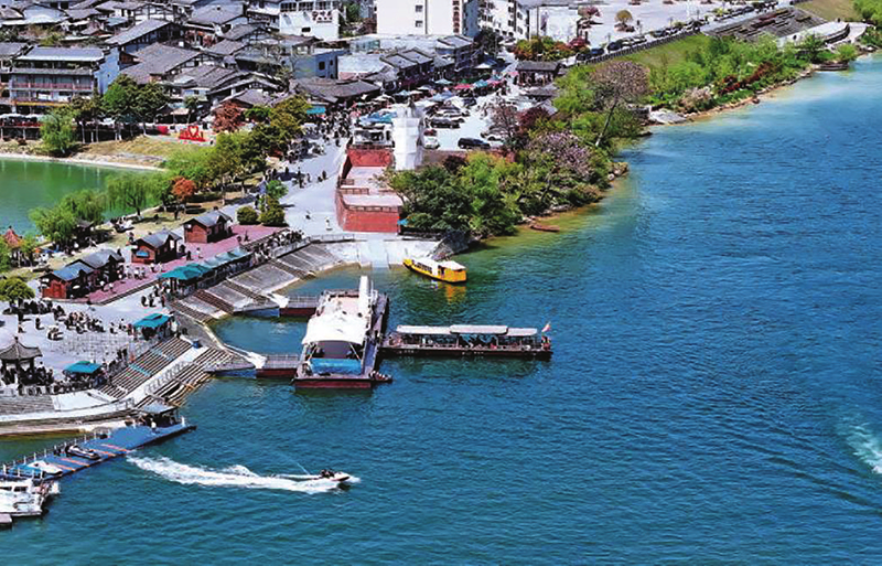 4月5日,游客在安康市石泉县后柳水乡乘坐游船观赏汉江春日美景。