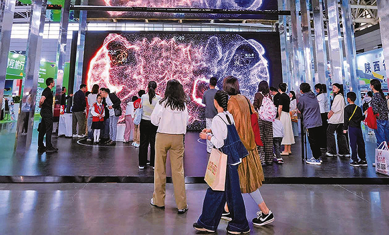 4月19日,为期3天的2026西安丝绸之路国际旅游博览会在西安国际会展中心圆满落幕,累计超12.03万人次进馆观展、体验与交流。图为当日,参观者在体验元宇宙实验室脑波风暴项目。