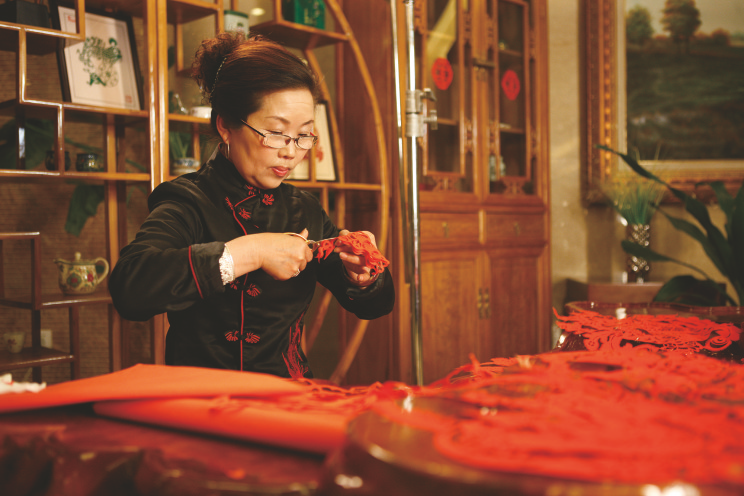非遗传承人曹宏霞在剪纸。