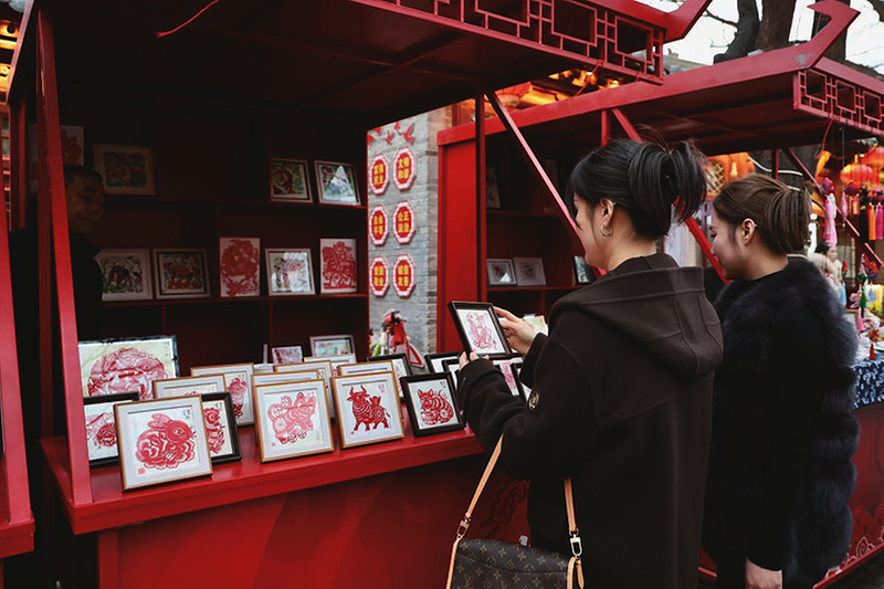 非遗集市上市民选购剪纸作品。