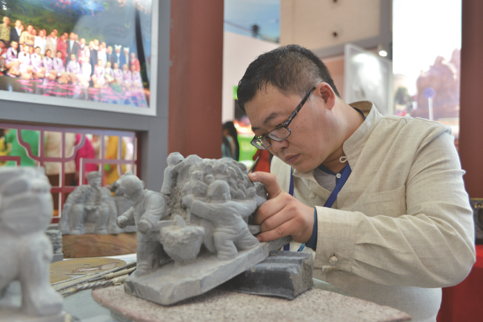 非遗传承人万军利制作石雕。