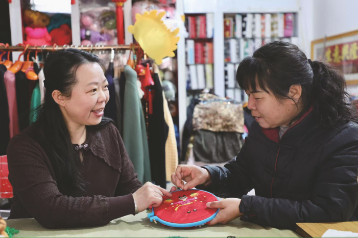 非遗传承人王爱苹(左)教学员刺绣。